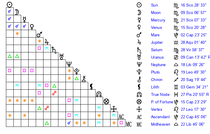 | Sun | 16 Scorpio 28 | 17 Scorpio 18 | 2 Aquarius 38 |