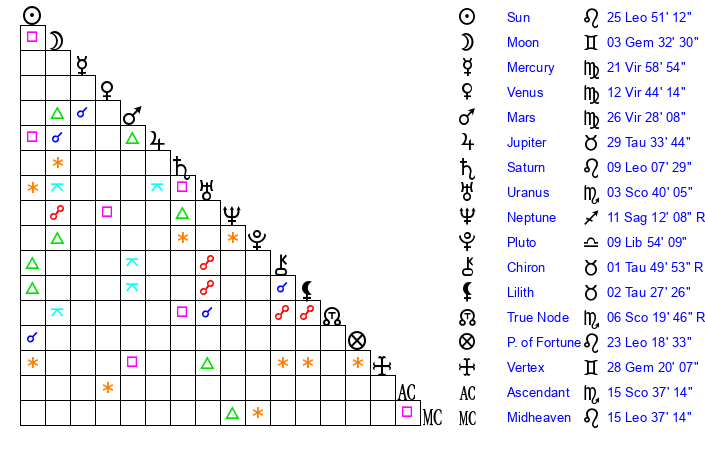 | Mercury | 21 Virgo 59 | 7 Leo 28 | 25 Virgo 41 |