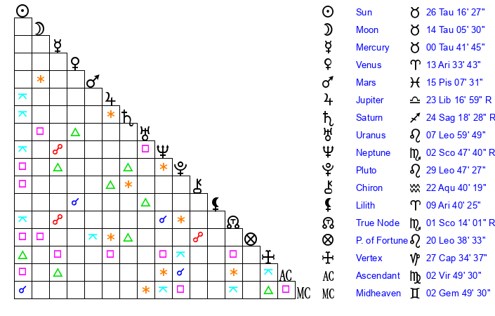 | Sun | 26 Taurus 16 | 27 Taurus 2 | 0 Leo 19 |