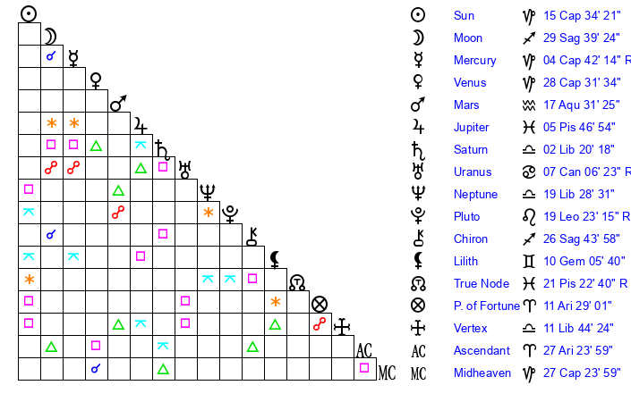 | Mercury | 4 Capricorn 42 | 27 Sagittarius 34 | 10 Aries 22 |