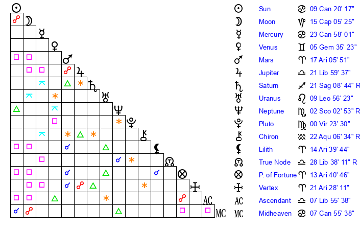 | Moon | 15 Capricorn 2 | 27 Virgo 56 | 16 Gemini 33 |