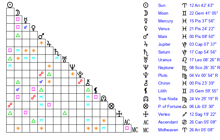 | Sun | 12 Aries 42 | 12 Aries 57 | 15 Gemini 43 |