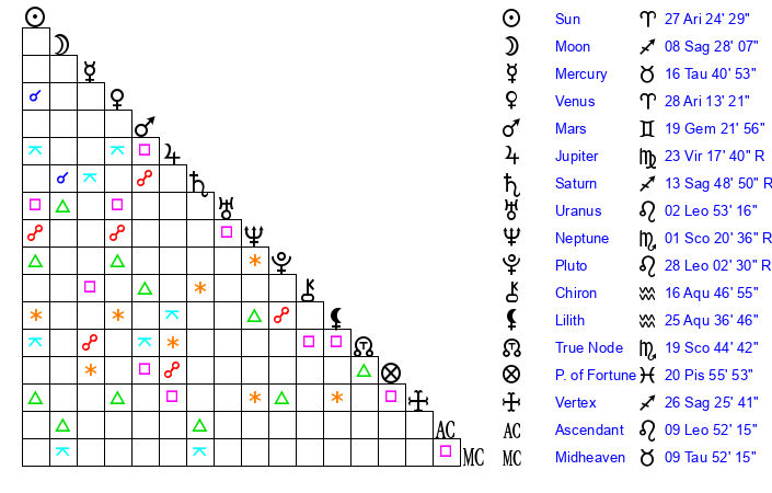 | Saturn | 14 Sagittarius 15 | 26 Pisces 21 | 9 Sagittarius 52 |