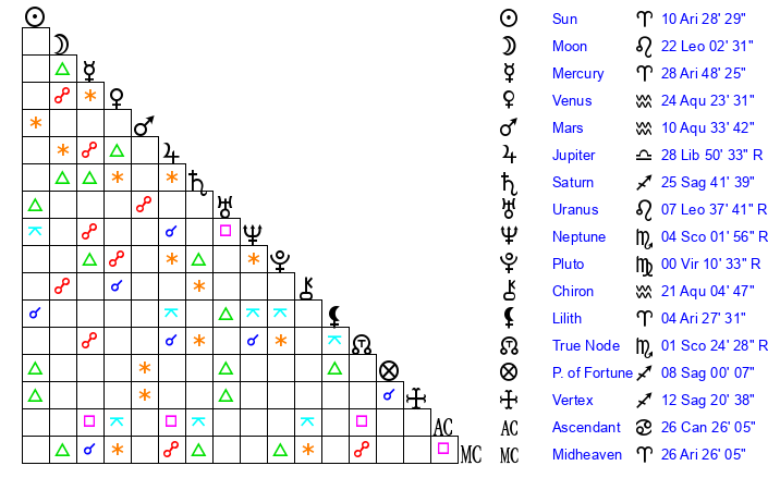 | Moon | 22 Leo 8 | 12 Taurus 59 | 16 Aquarius 22 |