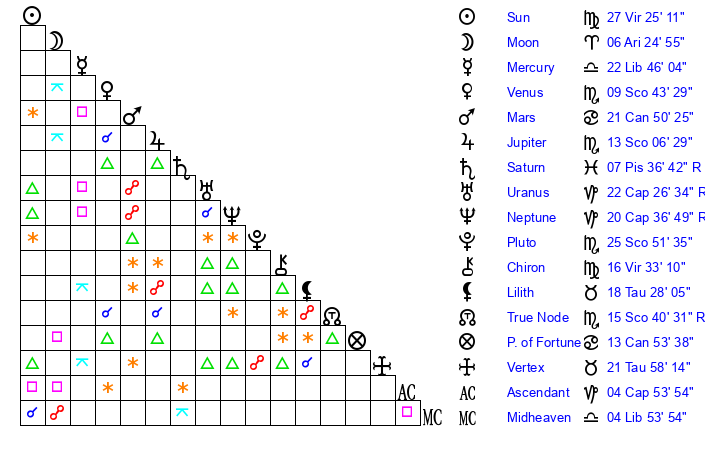 Moon | 6 Aries 20 | 13 Virgo 55 | 20 Taurus 55 |