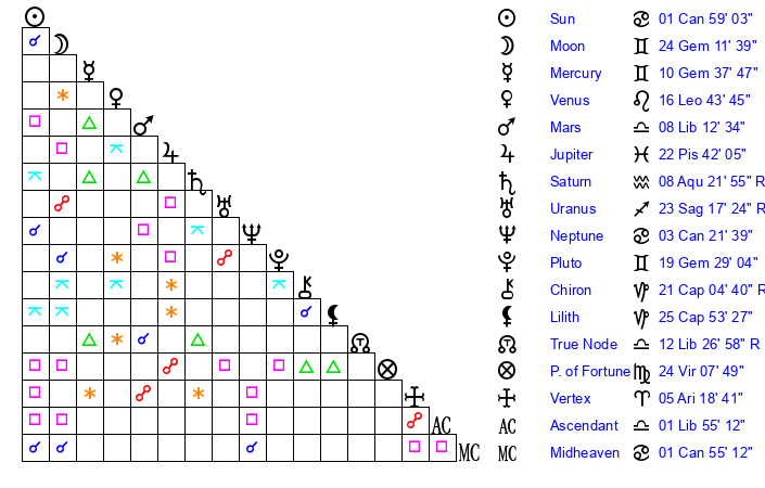 | Moon | 24 Gemini 11 | 23 Gemini 25 | 19 Sagittarius 40 |