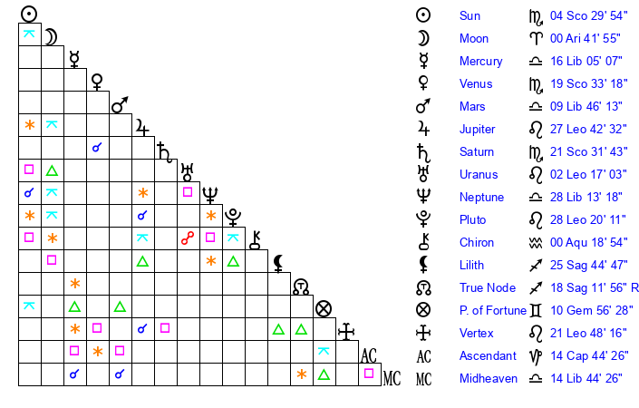 | Moon | 0 Aries 39 | 24 Capricorn 21 | 5 Scorpio 38 |