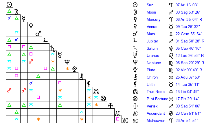 | Moon | 0 Sagittarius 49 | 27 Pisces 47 | 0 Taurus 6 |