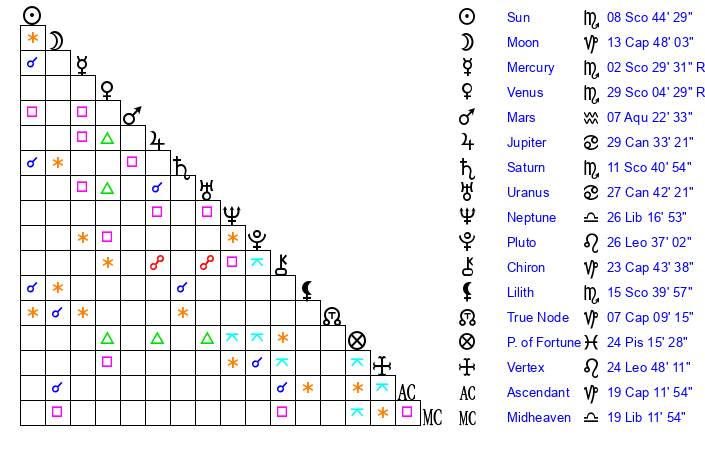 | Sun | 8 Scorpio 44 | 9 Scorpio 31 | 20 Capricorn 42 |