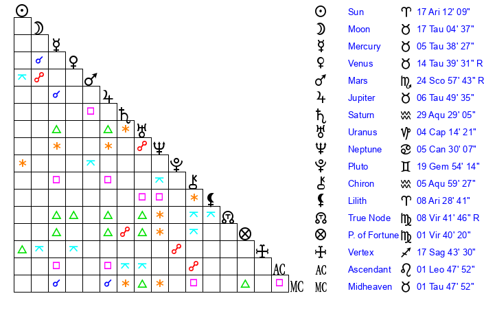 | Sun | 17 Aries 12 | 18 Aries 7 | 12 Leo 34 |