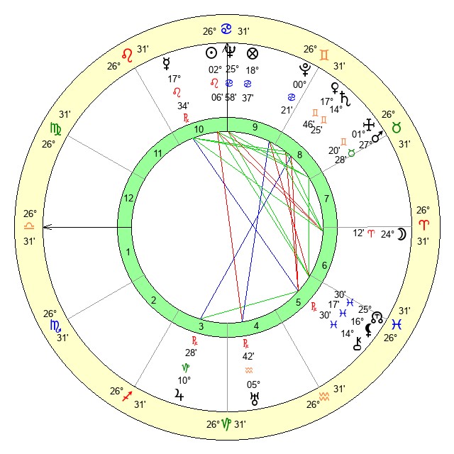 | Moon | 24 Aries 3 | 14 Leo 26 | 0 Gemini 22 |