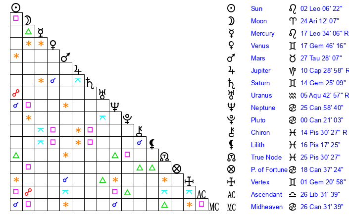 | Moon | 24 Aries 3 | 14 Leo 26 | 0 Gemini 22 |