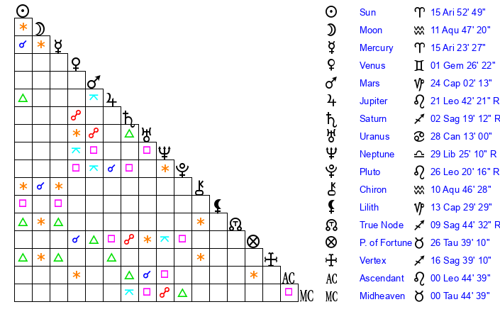| Sun | 15 Aries 52 | 16 Aries 9 | 22 Gemini 37 |