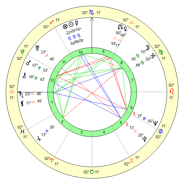 | Moon | 10 Virgo 51 | 9 Virgo 1 | 26 Aquarius 9 |