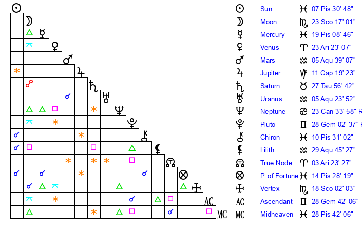 | Sun | 7 Pisces 31 | 8 Pisces 21 | 26 Gemini 49 |