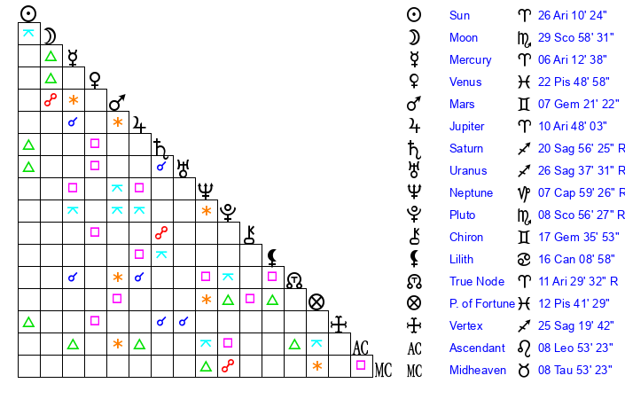 | Sun | 26 Aries 10 | 26 Aries 57 | 3 Gemini 0 |