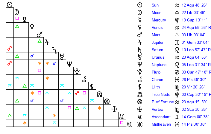 | Sun | 12 Aquarius 48 | 13 Aquarius 51 | 28 Taurus 36 |