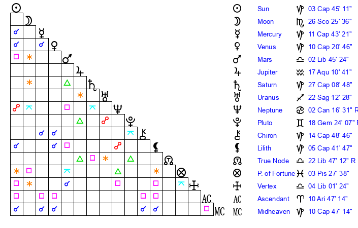 | Venus | 10 Capricorn 21 | 2 Capricorn 14 | 12 Gemini 8 |