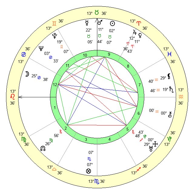 | Mars | 11 Taurus 44 | 1 Leo 54 | 4 Leo 14 |