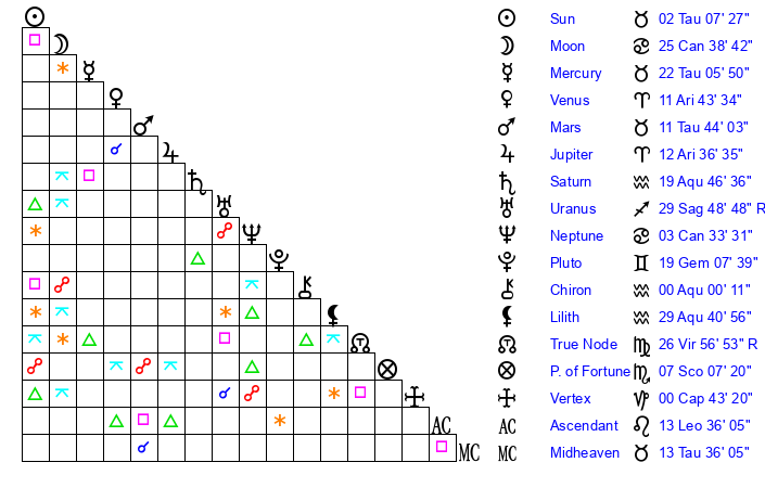 | Uranus | 29 Sagittarius 45 | 25 Taurus 52 | 25 Sagittarius 59 |