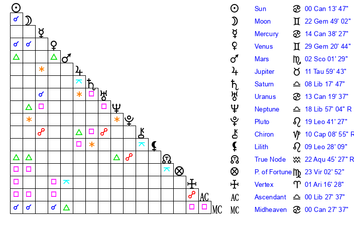 | Moon | 22 Gemini 40 | 9 Taurus 9 | 19 Aquarius 56 |