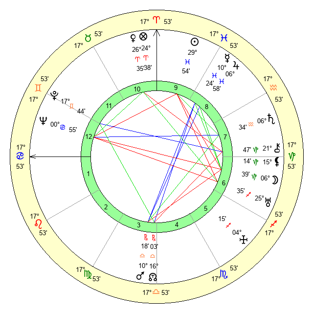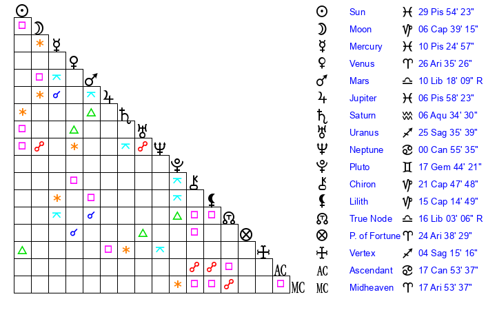 | Sun | 29 Pisces 54 | 1 Aries 20 | 27 Cancer 44 |
