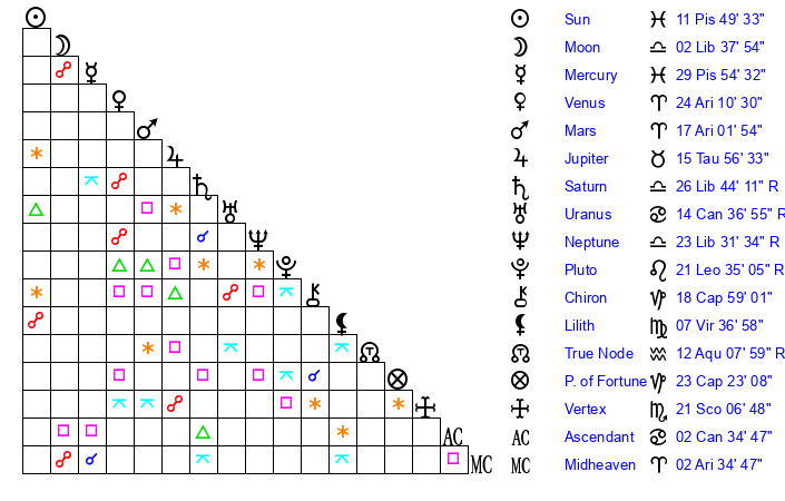 | Sun | 11 Pisces 49 | 12 Pisces 22 | 22 Taurus 37 |