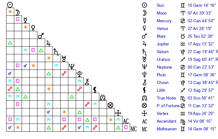 | Pluto | 17 Gemini 59 | 3 Aquarius 38 | 19 Gemini 40 |