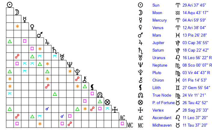 | Venus | 12 Aries 38 | 25 Pisces 29 | 2 Cancer 29 |