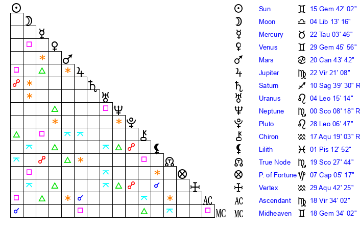 | Sun | 15 Gemini 42 | 16 Gemini 14 | 20 Leo 39 |