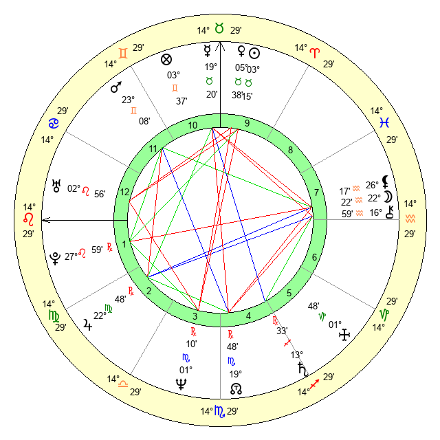 | Moon | 22 Aquarius 16 | 6 Pisces 54 | 17 Leo 29 |