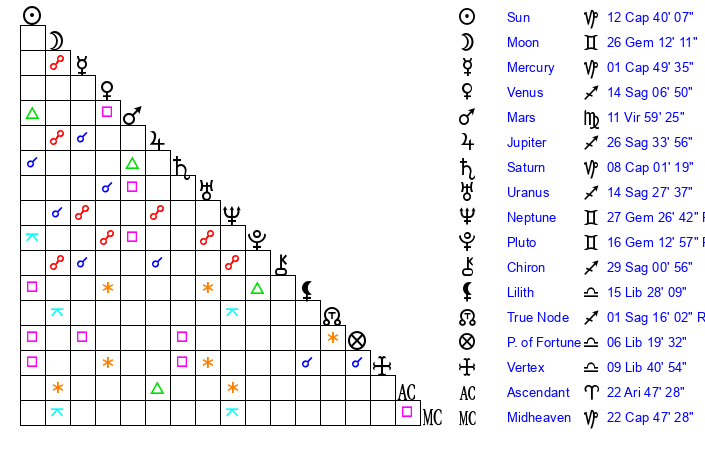 | Jupiter | 26 Sagittarius 22 | 21 Cancer 0 | 12 Capricorn 41 |