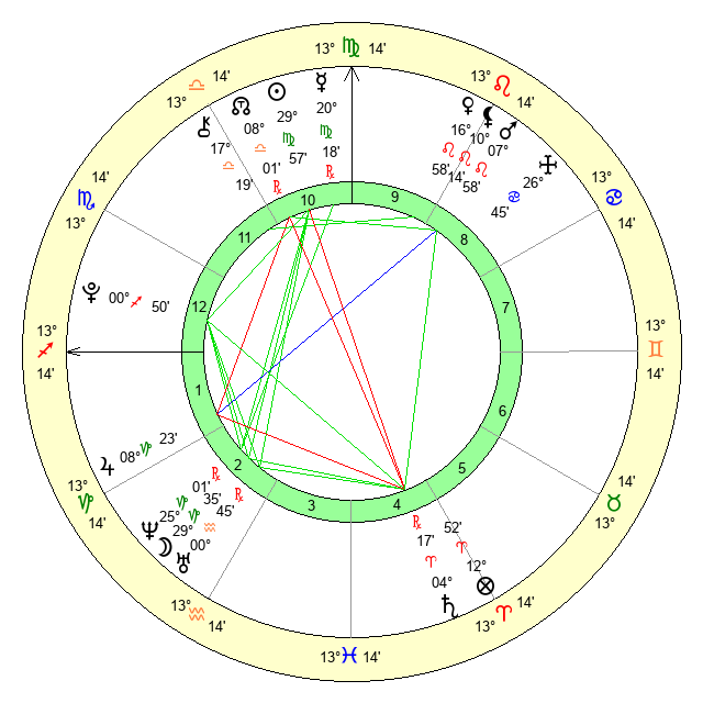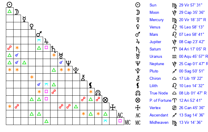 Venus | 16 Leo 58 | 3 Virgo 53 | 20 Virgo 39 |