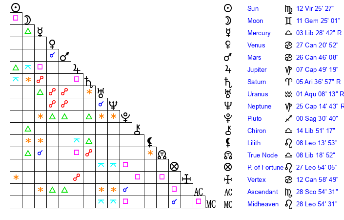 Mercury | 3 Libra 29 | 4 Virgo 8 | 22 Virgo 54 |