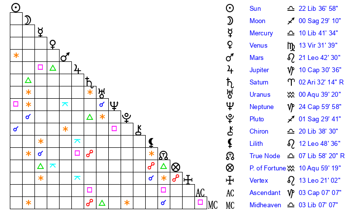 Sun | 22 Libra 37 | 22 Libra 50 | 20 Scorpio 36 |