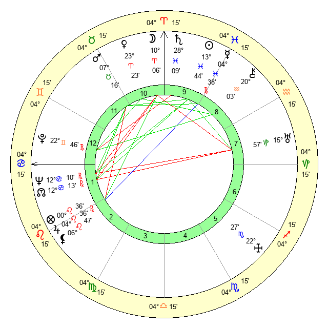 | Sun | 13 Pisces 44 | 14 Pisces 22 | 7 Cancer 30 |