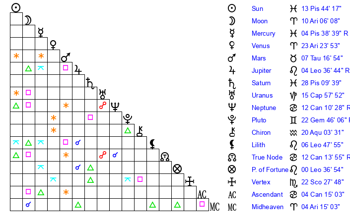 | Sun | 13 Pisces 44 | 14 Pisces 22 | 7 Cancer 30 |