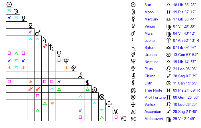 | Saturn | 7 Libra 35 | 26 Pisces 48 | 14 Libra 41 |