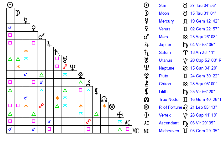 | Pluto | 24 Gemini 39 | 3 Aquarius 46 | 26 Gemini 51 |