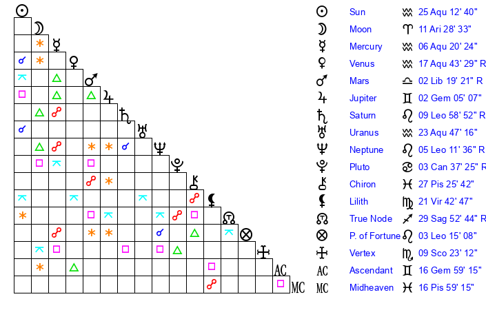 | Sun | 25 Aquarius 12 | 26 Aquarius 15 | 10 Gemini 22 |