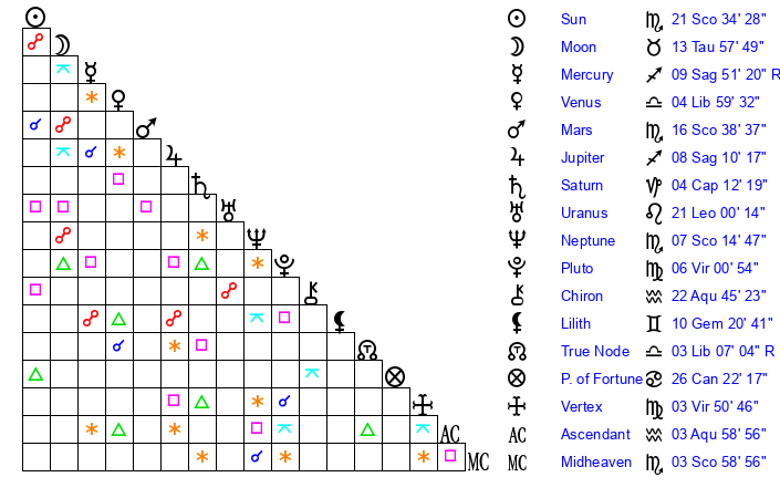 | Moon | 13 Taurus 54 | 21 Virgo 26 | 4 Libra 46 |