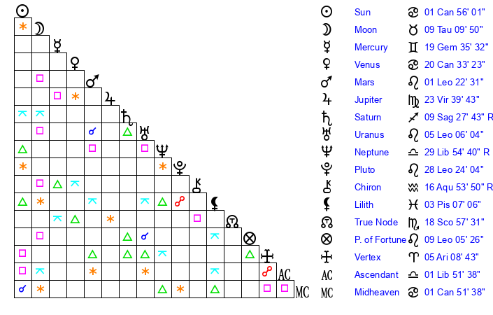 | Saturn | 9 Sagittarius 55 | 1 Aries 30 | 8 Sagittarius 23 |