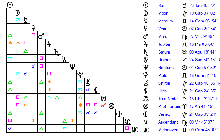 | Moon | 10 Capricorn 33 | 28 Sagittarius 30 | 22 Gemini 35 |