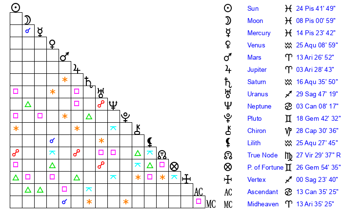 | Sun | 24 Pisces 42 | 25 Pisces 22 | 21 Cancer 46 |
