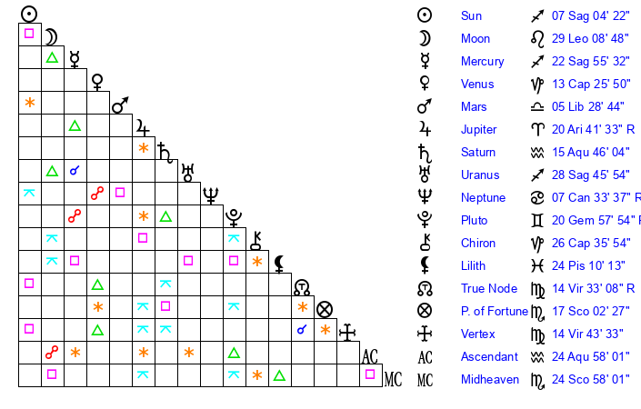 | Uranus | 28 Sagittarius 43 | 29 Taurus 7 | 4 Capricorn 9 |