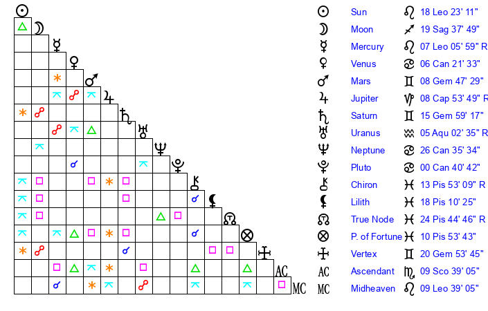 | Sun | 18 Leo 23 | 19 Leo 16 | 8 Sagittarius 55 |