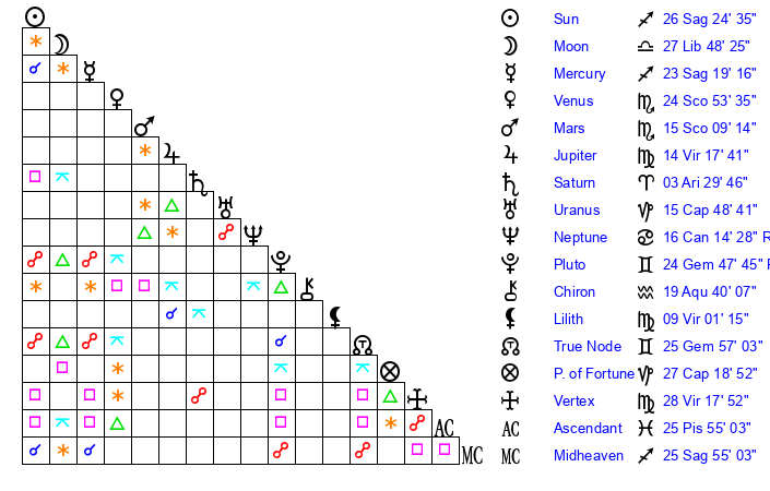 | Sun | 26 Sagittarius 25 | 27 Sagittarius 1 | 24 Aries 6 |
