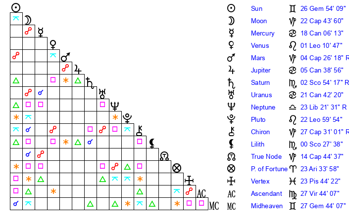 | Moon | 22 Capricorn 50 | 26 Pisces 23 | 7 Virgo 58 |