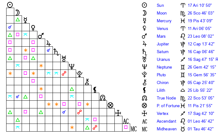 | Sun | 17 Aries 10 | 18 Aries 7 | 16 Leo 22 |