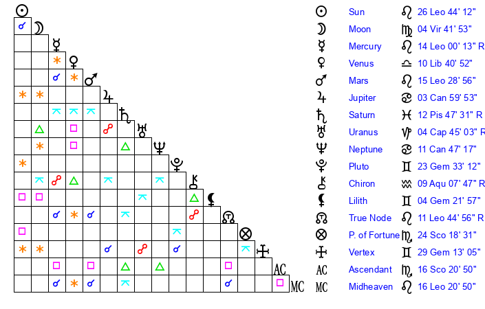 | Mercury | 14 Leo 0 | 9 Leo 26 | 3 Sagittarius 26 |